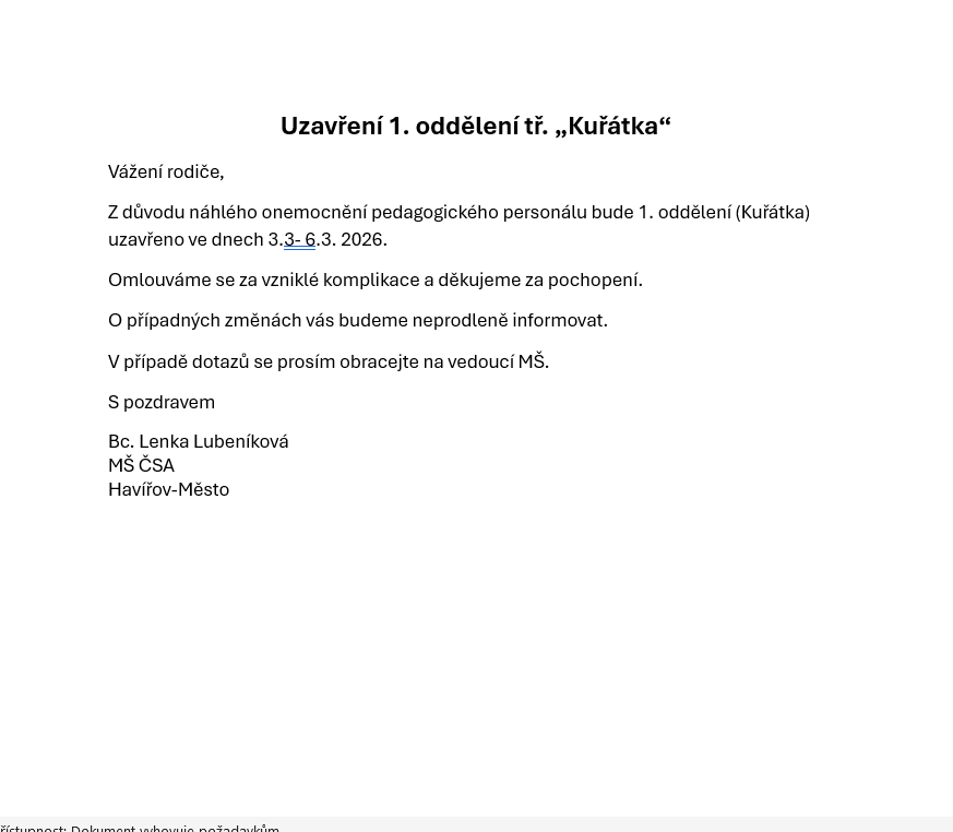 POČÍNAJE DNEM 3. 11. 2025 JSOU NA KAŽDÉ TŘÍDĚ POŘÍZENÉ NOVÉ MOBILNÍ TELEFONÍ ČÍSLA. ČÍSLA NAJDETE V SEKCI KONTAKTY, NEBO U SVÝCH TŘÍDNÍCH UČITELEK. VEŠKERÉ DOTAZY A OMLUVENÍ DĚTÍ, VOLEJTE NA ČÍSLA SVÉ TŘÍDY. NEPIŠTE SMS, POUZE VOLEJTE!